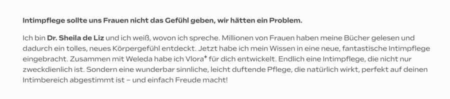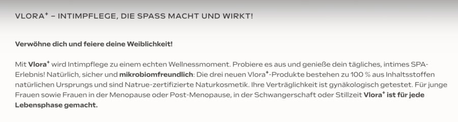 Pflegeprodukte für die Vagina und Vulva sollten nie als Lifestyle-Produkt gesehen werden. Ein Produkt für den Intimbereich sollte daher auch keinen „Spaß“ machen und das Wording „tägliches, intimes SPA-Erlebnis“ vermittelt als wäre es notwendig, den Intimbereich täglich mit Pflegeprodukten zu verbessern, zu optimieren.